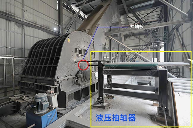 機體設有觀察門,大型設備機殼側板上留有抽軸孔,更換錘頭和錘軸只需卸掉外側的擋軸板,通過液壓抽錘軸裝置就可方便、快捷的更換,省時省力。