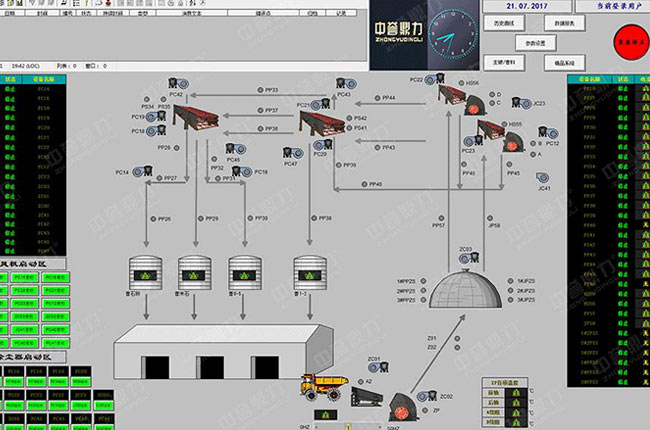 通過(guò)中控系統(tǒng)可以實(shí)現(xiàn)礦山設(shè)備的一鍵開(kāi)關(guān)及單獨(dú)控制,通過(guò)傳感器等自動(dòng)采集設(shè)備運(yùn)行狀體及工作情況,如軸承溫度、設(shè)備工作電流、電壓、速度等狀態(tài)監(jiān)測(cè),對(duì)電量、產(chǎn)量統(tǒng)計(jì)。實(shí)現(xiàn)各級(jí)設(shè)備及各環(huán)節(jié)的集中控制及管控。