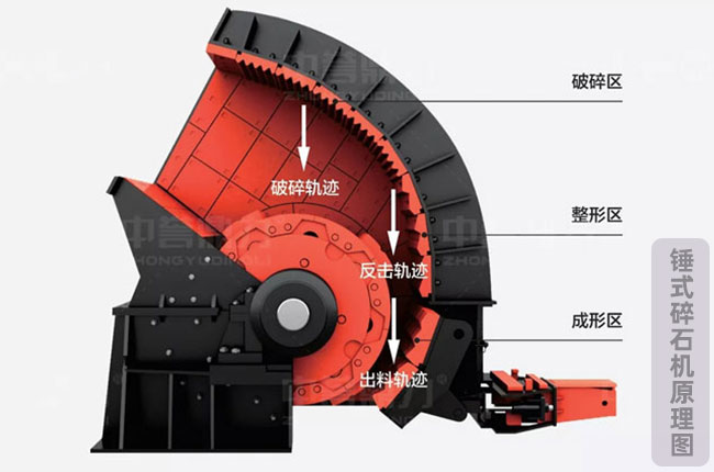 石頭通過給料機送入錘式碎石機破碎腔中,通過轉子帶動錘頭高速旋轉對物料進行破碎,物料被錘頭打擊破碎,然后被打擊到周圍襯板上,再次產生破碎,如此反復顆粒小到可以通過下一階段,會自動下落,直到可以從下料口排出。