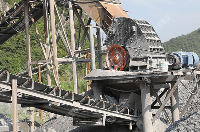 石料粉碎機(jī)由機(jī)殼、轉(zhuǎn)子、反擊襯板、調(diào)節(jié)襯板等部位組成,其中轉(zhuǎn)子是整臺設(shè)備的部位。當(dāng)物料進(jìn)入破碎腔以后,轉(zhuǎn)子上排列整齊的錘頭會在電機(jī)的帶動下甩動起來,對物料進(jìn)行打擊,打擊后的物料四散到機(jī)殼四壁,被鑲嵌在四周的反擊襯板反擊形成二次破碎,同時(shí)物料之間也會相互破碎,符合調(diào)節(jié)襯板縫隙的石子會透過出料口完成出料。