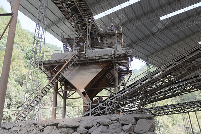 篩分單元:在毛石含泥量較大時,應調大棒條給料機棒條間距,提高篩分效率,進入鄂破的毛料含泥量達標。棒條給料機篩下物料經土篩篩選回收可使用細毛石。