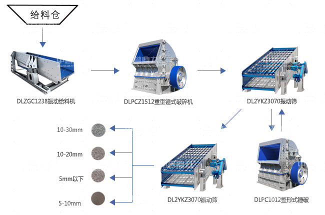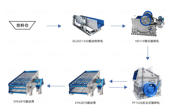 • 主要設備:DLZGC1238振動給料機、DLPCZ1512重型錘式破碎機、HD110顎式破碎機、YKZ3070圓振篩等
