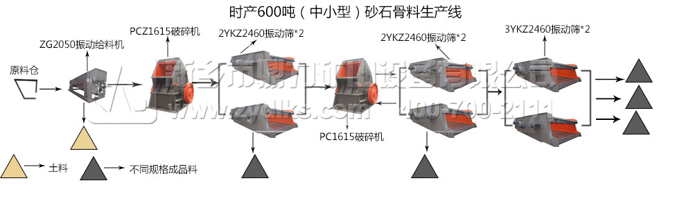從工藝流程圖可以看到,時(shí)產(chǎn)600噸的中小型砂石骨料生產(chǎn)線不像大型、大型的生產(chǎn)線那種復(fù)雜曲折,這個(gè)工藝流程圖比較通俗易懂,一目了然。原料倉(cāng)的物料進(jìn)過(guò)振動(dòng)給料機(jī)進(jìn)入破碎機(jī)破碎腔內(nèi)進(jìn)行破碎的工作,破碎的物料經(jīng)過(guò)兩臺(tái)振動(dòng)篩的同時(shí)篩分,一部分物料經(jīng)過(guò)篩分得到顆粒粒度合適的成品料,另一部分物料直接進(jìn)入二級(jí)破碎機(jī)破碎腔內(nèi)部進(jìn)行再次破碎,然后再經(jīng)過(guò)不同直徑規(guī)格的振動(dòng)篩進(jìn)行篩分,再次獲得不同顆粒粒度的成品料。