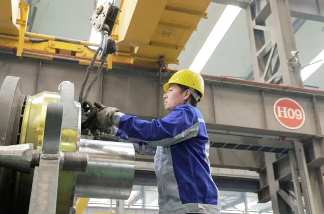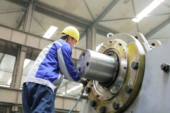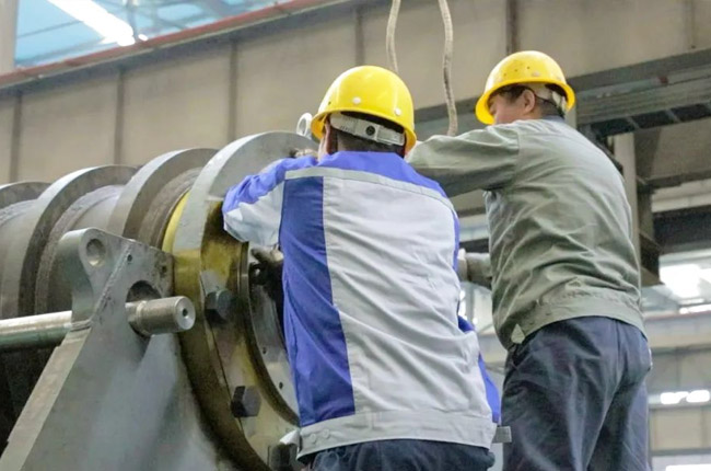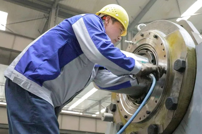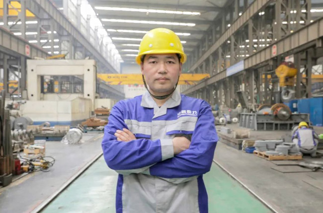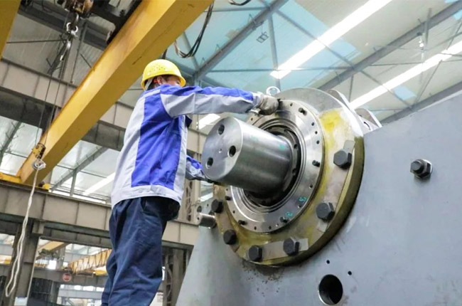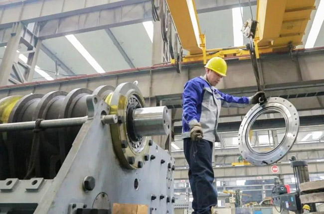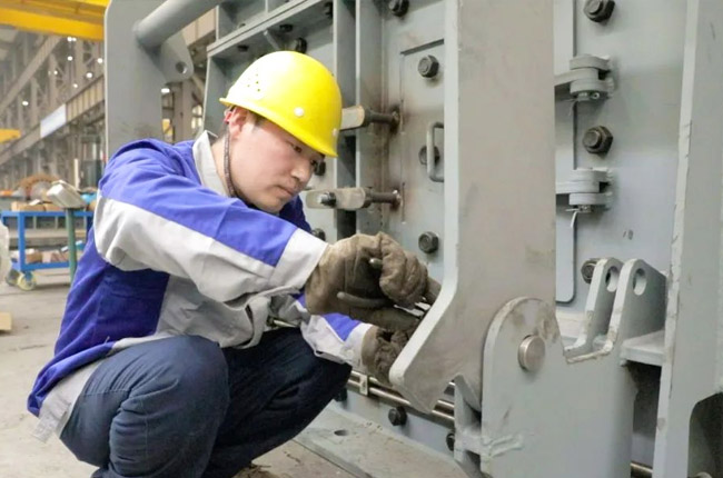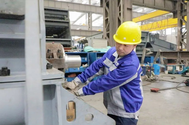 采訪第一事業部成裝組裝配員工馮浩然的時候,他正在裝配一臺即將發貨的DLEV125顎式破碎機,從液壓充氣到壓蓋組裝,安裝30個螺絲,只需短短2-3分鐘的時間。用尺子測量軸承間距,進行反復對比,裝配完成后,對零件的相互位置、配合間隙、松緊情況等進行調整,然后再進行面的精度檢驗,后進行試運行,面檢查機器運轉的靈活性、密封性、轉速、功率等各項功能。
