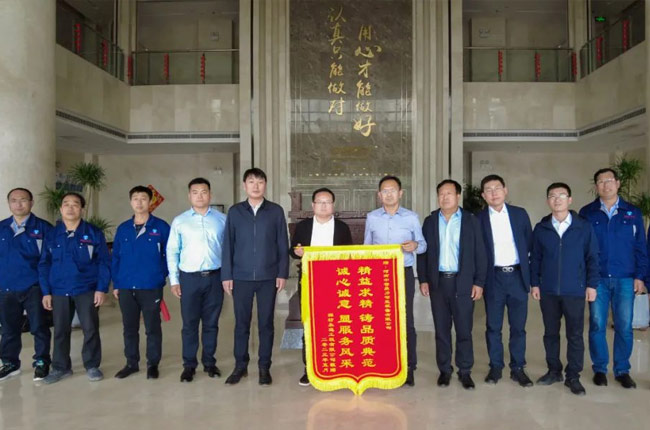考察團來到中譽鼎力廠區后,首先送上了感謝錦旗,盛贊中譽鼎力“精益求精,鑄品質;誠心誠意,顯服務風采”。