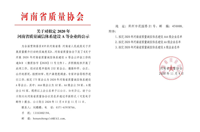 為面貫徹落實(shí)《中共河南省委河南省人民關(guān)于開展質(zhì)量提升行動(dòng)的實(shí)施意見》,河南省質(zhì)量協(xié)會下發(fā)了《關(guān)于開展2020年河南省質(zhì)量誠信體系建設(shè)A等企業(yè)評估工作的通知》(豫質(zhì)協(xié)字[2020]11號文件),中譽(yù)鼎力軟件科技股份有限公司積參評。公司自成立以來,堅(jiān)持“一言九鼎誠信天下”的經(jīng)營理念,秉持對客戶負(fù)責(zé)的態(tài)度,以工匠精雕鑄鼎力品質(zhì),不斷開拓公司業(yè)務(wù),樹立了守法履約的良好企業(yè)形象和客戶口碑,入選“2020年河南省質(zhì)量誠信體系建設(shè)AA級企業(yè)”名單。
