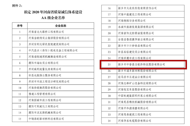 近日,新鄉(xiāng)市中譽(yù)鼎力軟件科技股份有限公司通過初審、用戶滿意度調(diào)查、評估等程序,成功入選“2020年河南省質(zhì)量誠信體系建設(shè)AA級企業(yè)”名單。