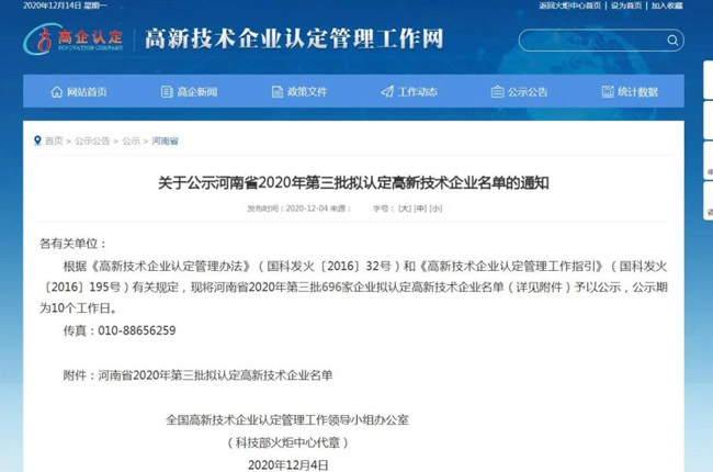 根據(jù)家《高新技術(shù)企業(yè)認(rèn)定管理辦法》(科發(fā)火〔2016〕32號(hào))和《高新技術(shù)企業(yè)認(rèn)定管理工作指引》(科發(fā)火〔2016〕195號(hào))有關(guān)規(guī)定,12月4日,高新技術(shù)企業(yè)認(rèn)定管理工作導(dǎo)小組辦公室在官網(wǎng)上對(duì)河南省2020年第三批擬認(rèn)定高新技術(shù)企業(yè)名單進(jìn)行了公示。