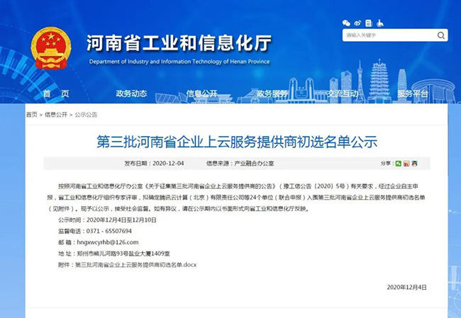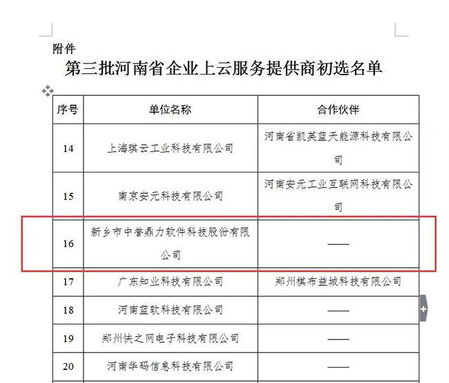 為貫徹落實《河南省智能制造和工業(yè)互聯(lián)網(wǎng)發(fā)展三年行動計劃(2018—2020年)》(豫政〔2018〕14號),完善企業(yè)云服務(wù)生態(tài)體系,加快省企業(yè)上云上平臺步伐,按照《河南省企業(yè)上云三年行動計劃(2018-2020年)》(豫工信產(chǎn)融〔2018〕92號)和2020年河南工信廳有關(guān)工作安排,今年10月,省工信廳公開征集第三批河南省企業(yè)上云服務(wù)提供商。經(jīng)自主申報、評審和網(wǎng)上公示,中譽鼎力軟件科技股份有限公司初步入選云服務(wù)商名單。