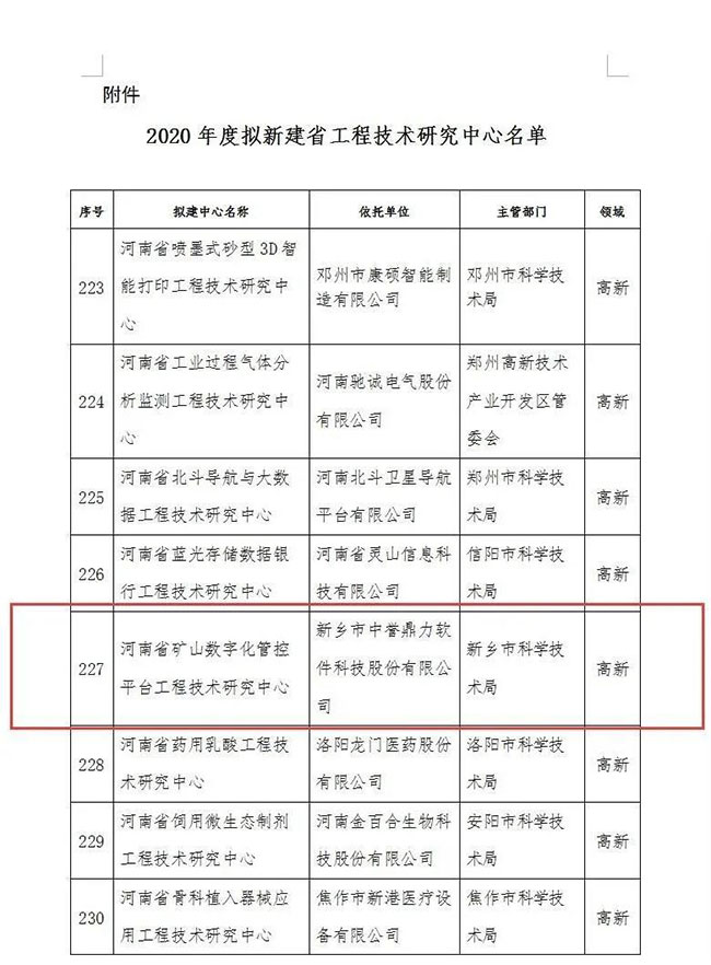 依托新鄉(xiāng)市中譽鼎力軟件科技股份有限公司建設(shè)的河南省礦山數(shù)字化管控平臺工程技術(shù)研究入選擬新建省工程技術(shù)研究名單,并順利通過公示。