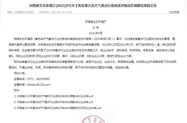 近日,河南省生態(tài)環(huán)境廳公布了《關(guān)于發(fā)布重污染天氣重點(diǎn)行業(yè)績效評級動(dòng)態(tài)調(diào)整結(jié)果的公告》([2021]5號(hào)),河南中譽(yù)鼎力智能裝備有限公司成功入選2020年重污染天氣重點(diǎn)行業(yè)績效評級動(dòng)態(tài)調(diào)整B級企業(yè)名單,并順利通過公示!