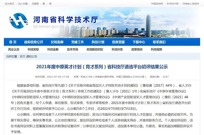 根據(jù)河南省委組織部、省科技廳等九部門《關(guān)于實(shí)施河南省高層次人才支持計(jì)劃的通知》(豫組通〔2017〕44號(hào))、省人才辦《關(guān)于開展2021年度中原英才計(jì)劃(育才系列)申報(bào)工作的通知》(豫人才辦〔2021〕1號(hào))和省科技廳《中原學(xué)者管理辦法》《中原科技創(chuàng)新軍人才管理辦法》《中原科技創(chuàng)業(yè)軍人才管理辦法》《中原產(chǎn)業(yè)創(chuàng)新軍人才管理辦法》(豫科〔2021〕48號(hào))的有關(guān)要求,經(jīng)個(gè)人申請(qǐng)、單位、形式審查、評(píng)審等程序,7月9日,2021年度中原育才計(jì)劃(育才系列)省科技廳遴選平臺(tái)初評(píng)工作完成,并將結(jié)果予以公示。