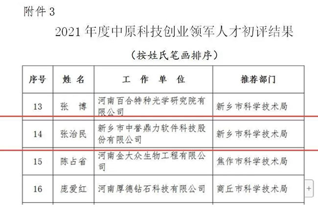 經(jīng)新鄉(xiāng)市科學(xué)技術(shù)局,新鄉(xiāng)市中譽(yù)鼎力軟件科技股份有限公司董事長張治民成功入選2021年度“中原科技創(chuàng)業(yè)軍人才”名單,并順利通過公示!