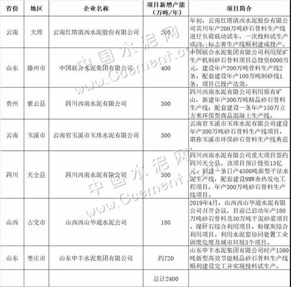 以下表格列舉了部分水泥企業(yè)2019年投產的砂石骨料生產線,年產骨料約2400萬噸。