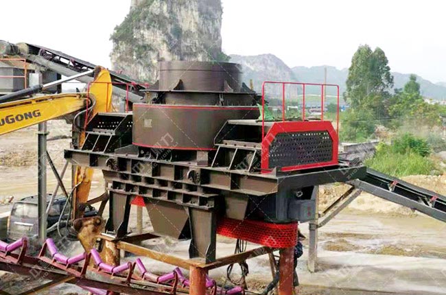 石料由機(jī)器上部直接落入高速旋轉(zhuǎn)的轉(zhuǎn)盤,在高速離心力的作用下,與另一部分以傘型方式分流在轉(zhuǎn)盤四周的靶石產(chǎn)生高速度的撞擊與高密度的粉碎,石料在互相打擊后,又會(huì)在轉(zhuǎn)盤和機(jī)殼之間形成渦流運(yùn)動(dòng)而造成多次的互相打擊、磨擦、粉碎,從下部直通排出。形成閉路多次特環(huán),由篩分設(shè)備控制達(dá)到所要求的粒度。