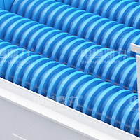 滾軸篩由箱體、軸承座、鏈條、鏈輪、滾軸、滾片、電機等結構組成。開機啟動后,鏈輪通過鏈條帶動滾軸翻轉,滾軸轉動方向與物料流動方向一致,泥土從相鄰滾軸與圓盤之間的間隙漏出,落在機器底部的皮帶機上排出,滾軸上方的大塊物料運動到設備末端后排出,完成泥石分離。各軸之間的間隙可以根據實際需求進行定制。