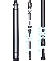 活塞、內(nèi)缸、配氣座、逆止閥和鉆頭附件等安裝在細(xì)長的外缸內(nèi),外缸上端裝帶扳手口和聯(lián)接螺紋的上接頭,下端裝有螺紋連接的卡釬套。