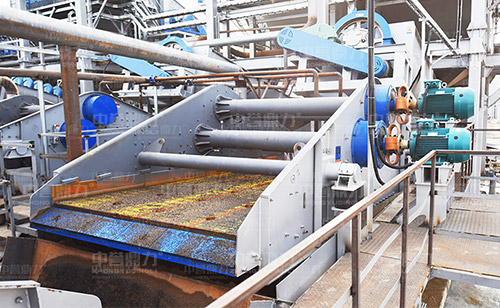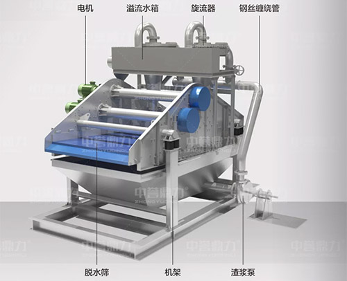 中譽(yù)鼎力細(xì)砂回收脫水一體機(jī)由旋流器、溢流水箱、鋼絲纏繞管、電機(jī)、脫水篩、機(jī)架、渣漿泵等組成,在工作時(shí),渣漿泵將篩水混合物輸送到旋流器中,細(xì)砂經(jīng)沉沙嘴進(jìn)入到下方的脫水篩中,經(jīng)脫水篩脫水后,細(xì)砂與水實(shí)現(xiàn)分離,剩余的少量細(xì)砂和泥等雜質(zhì),經(jīng)過溢流水箱進(jìn)入污水處理系統(tǒng),沉淀后進(jìn)行水資源再次利用。