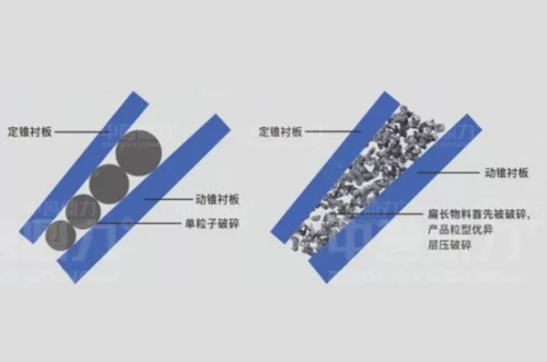 通過采用粒間層壓原理設(shè)計,利用物料間相互擠壓,扁長物料先被破碎,可以提高破碎效率和細料比例,在很大程度上減少針片狀物料,產(chǎn)品粒形好,并且易損件鋼耗小;