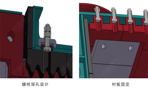 該系列機(jī)型采用六角頭高強(qiáng)螺栓固定主襯板、側(cè)襯板,螺栓頭部沉孔為深孔型設(shè)計(jì),防止由于破碎原材料小而磨損螺栓頭部
