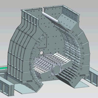 機殼采用雙腔對稱設計,可一次性容納更多物料,提高破碎產(chǎn)量,工作時,電機帶動錘頭高速運轉(zhuǎn),對從上方落入的物料形成沖擊力,此時的物料獲得動能后高速撞向機腔內(nèi)壁的反擊板,造成物料的次破碎,從物料進入機腔便相互碰撞形成自粉碎,物料在多次撞擊、研磨作用下達到所需粒度,從機腔側(cè)下方出料口排出,完成破碎過程。