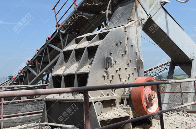 大塊石料經料倉均勻、連續的送到PCZ1512重型錘式反擊破碎機進行粗碎,粗碎后的物料經輸帶送到一臺2YKZ2460振動篩進行篩分,篩分出一種20-30成品石子,大于31.5mm的料被一套輸送帶返回進行再次破碎,小于31.5的碎石被輸送到一臺2YKZ2460進行篩分,篩分出10-30、5-10和石粉三種成品料。