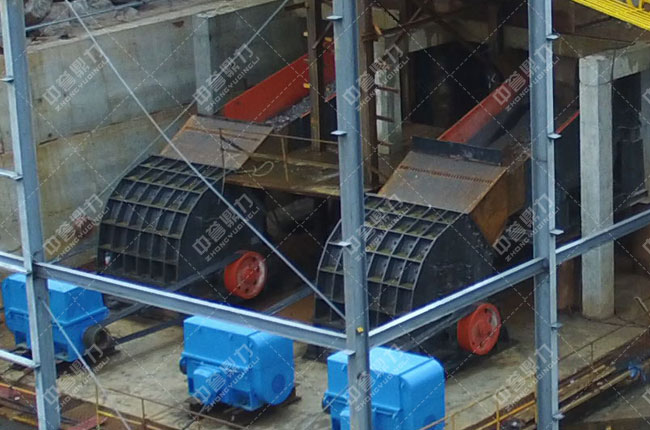 大塊石料經(jīng)ZGC2050振動(dòng)給料機(jī)均勻、連續(xù)的送到PCZ1620重錘破進(jìn)行破碎,破碎后的物料被送到中轉(zhuǎn)料倉(cāng),再由兩臺(tái)ZGC2038給料機(jī)送到兩臺(tái)PC1220整形錘破進(jìn)行整形加工,經(jīng)過(guò)再次加工的物料被輸送到一組3臺(tái)3YKZ3070振動(dòng)篩進(jìn)行篩分,篩分出1-3以下的石料、土石粉和一部分回料,1-3以下的料被輸送到下一組3臺(tái)3YKZ3070振動(dòng)篩進(jìn)行再次篩分,回料被返料帶返回整形錘破進(jìn)行再次破碎,形成一個(gè)閉路循環(huán),終篩分出1-3/1-2/0-5和石粉四種成品料。