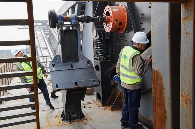 在項目建設現場,售后服務團隊深入破碎機頂部認真檢查每一個配件,并就項目的安裝、設計工藝等進行詳細說明和安裝指導。